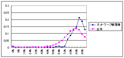 ![]() | (グラフ 3)ネットワーク管理者の得点を表すグラフの頂点は全体平均と比して得点分布の低い左側にずれており高得点者の比率が突出して高い |
