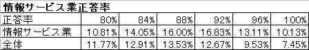 卸売・小売業は、正答率が高い分布では全体より少なくなっています。90%以上の正答率の分布では、情報サービス業の半分以下という結果です。グラフにしてみると、点数の分布が広くなっているのも見て取れます。一般的にパソコンの利用率は情報サービス業の方が高いと考えられますので、この二つの業種の正答率の差に表れていると言えるでしょう(グラフ2)。