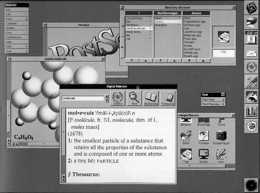 傍注として:NeXTStepの書き方は、少なくとも5種類ある。4種は公式な用法で、どのバージョンに言及しているかにより異なる。すなわちNeXTStep、NeXTStep、NeXTSTEP、NEXTSTEPの4種で、5番目はNeXTが認めてはいたが、使用しなかった書き方のNextStepだ。混乱を避けるため、我々は一貫してNeXTStepという表記を用いることにする。同じことが、関連するAPI定義OpenStep/OPENSTEP、別名NEXTSTEP 4.0にも当てはまる。