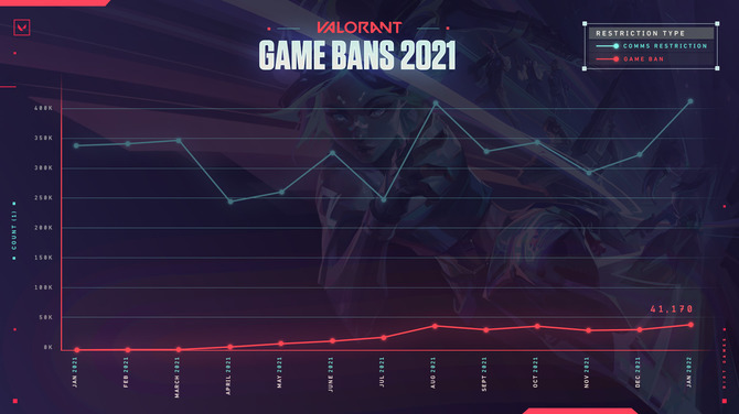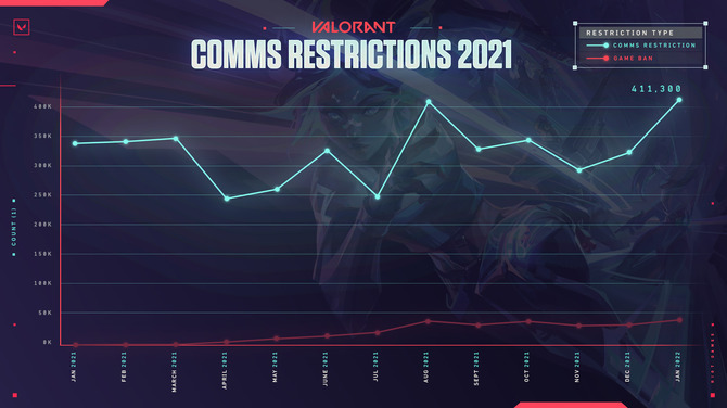一方、BANは「有害なコミュニケーションを繰り返したアカウント」に課されるとのことで、その悪質さに応じて数日から永久まで期間が変動。実行されたBAN数は、新システムが導入された辺りから徐々に増加。2022年1月まで一定数を保ち続けています。また、別途行われたプレイヤー調査からも「プレイヤーがハラスメントに遭遇する頻度はそこまで減少していない」と公式見解を述べました。