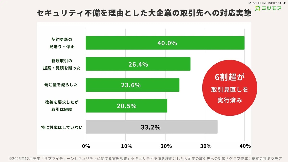 セキュリティ不備を理由とした大企業の取引先への対応実態について調査したところ、大企業の66.8%が「契約停止や改善要求などの取引見直し」を実行したと回答しており、具体的に「契約更新を見送った・停止した」が40.0%、「新規取引の提案・見積もりを断った」が26.4%であった。
