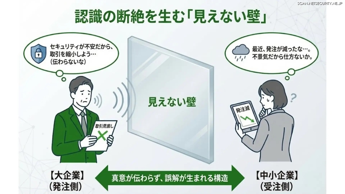 その一方で 取引停止を経験した中小企業で理由として挙げられたのは「景気悪化」が15.6%、「価格競争」が11.8%で上位となり、「セキュリティ」はわずか4.3%にとどまり、大企業の実態と認識にズレがあることがわかった。