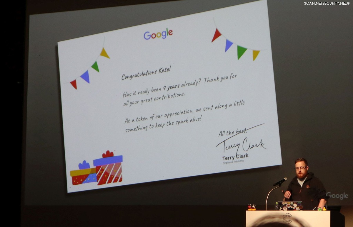 「おめでとう、Kate! もう4年になるんですね。あなたの貢献に感謝します。ささやかですが、お祝いの品をお送りします」