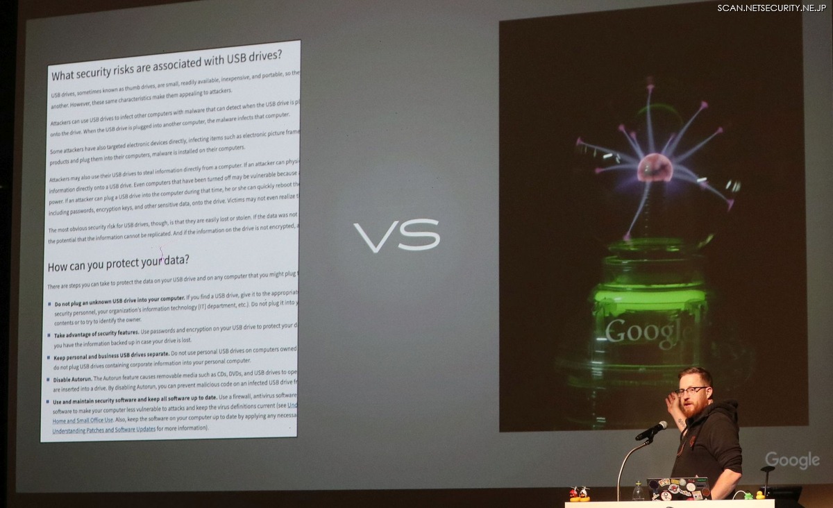 講演冒頭のプラズマグローブを思い出してほしい、と彼は促した。USB キーストローク・インジェクションという脅威は、当時すでにさして新奇なものではなかった。「見て、触って、手に取ることができる物体があり、それに物語(story)が付随している。それとも、脅威の説明文が文字情報だけで提示されるとしたら、あなたならどちらが心に残りますか」