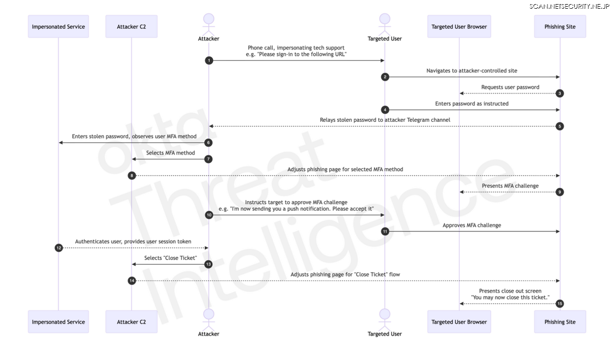 ・攻撃者は通話内容に合わせて、OTP入力、プッシュ通知の承認、その他のMFA操作を促すためのページをリアルタイムでフィッシングサイトに反映します。