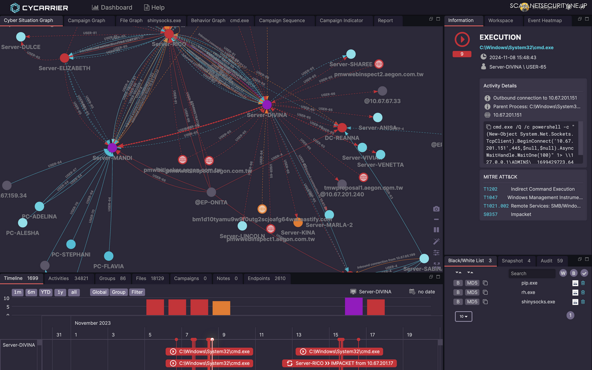 これまで熟練の技術者が手作業で再構成していた攻撃経路の可視化作業も CyCarrier は自動で行う。どの端末から侵入し、どう横展開したかが、まるで「あみだくじ(記者の目にはそう見えた)」状の図として一目で把握できる。可視化チャートには時系列情報や実行コマンド、MITRE ATT&CK 対応などの判断根拠も明示されるため、ランサムウェア被害などの対応の際は経営層への説明資料としても活用できる。