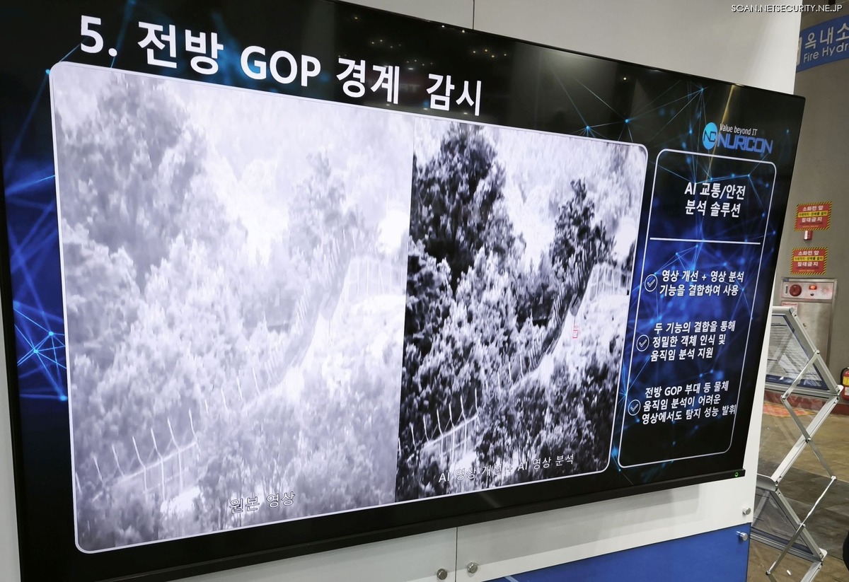 ブースでは北朝鮮との国境付近で起きた爆発(!)の監視カメラの画像を、拡大・鮮明化させるデモを行っていた。爆発は、記録映像で古いカメラによる撮影だったが、爆炎、周辺で活動する兵士の手足の動きの解像度が上がっている。無論爆発は北からの軍事行動によるものだという。